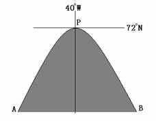 [例2]如上图,P点的纬度为72ºN,经度为40ºW,弧PAB为晨昏线,则太阳直射点的地理坐标为 ,此时北京时间为 。