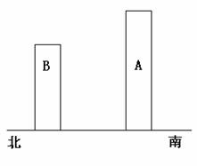 [例5]如图,现计划在某城市(36.5ºN)的A楼(高50米)的附近兴建一座B楼,为使B楼最底层全年都能受到太阳光照射,则A楼和B楼之间的距离最少为几米?