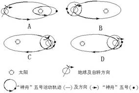 解析:在太空中,“神舟”飞船绕地球运动,方向与地球自转方向相反;还要注重地球绕日公转轨道示意图,在近日点附近,太阳直射点应位于南半球,由此可以判断图中地球绕日公转示意图。