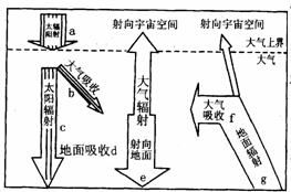 ⑴在图示各项内容中,由于_____、_____(填写代表的英文字母)的存在。使大气具有“温室效应”(保温效应)。