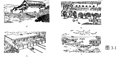 图3-1四种房屋建筑,反映了四种不同的建筑文化,也反映了我国自然环境的地区差异,读图回答下列问题: