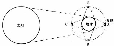 20.下图是日、地、月运动示意图。A、B、C、D表示月球绕地运动的位置,此时地球上产生小潮,且是农历上半月,那么月球在A、B、C、D那点位置上。