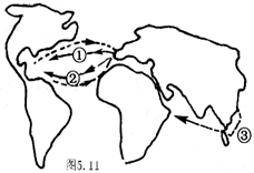 哥伦布于1492年第一次沿图中①线用了37天时间横渡大西洋到达美洲,次年沿图中②线仅用20天到达美洲。我国郑和沿图中③线下西洋比哥伦布航行大西洋早了整整半个世纪。据图回答10-11题。