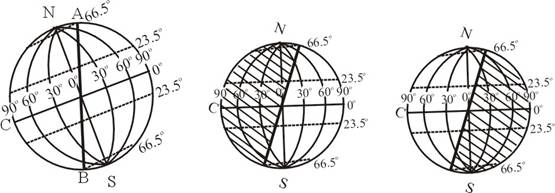 26.读太阳光照图,甲图中AB为晨昏线,乙、丙图中的阴影部分代表黑夜。据图完成下列要求。(12分)