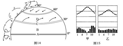 读“北半球的气压带和风带示意图(图14)”和“某两种气候类型的气温曲线和降水量柱状图(图15)”,回答相关问题。(6分)