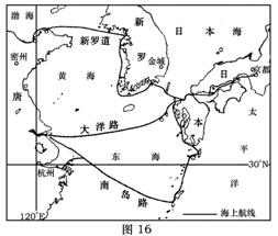 读“唐代中日的海上交通图”(图16),结合所学知识回答下列问题。(10分)