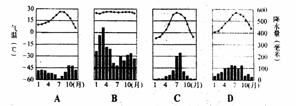 39、下列四幅图中,表示温带季风的气温和降水量特点的是( )