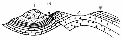 (1)图中丁处地质构造名称是________(背斜、向斜),地貌名称是 。