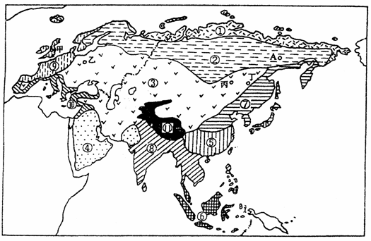 46、读“欧亚大陆气候类型分布图”,完成下列各题:(10分)