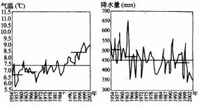 下图是我国华北地区1945年一2002年气温与降水变化示意图,完成2题。