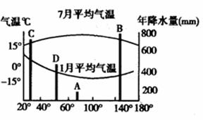 读“40°N亚欧大陆1月和7月温度变化曲线及各地年降水量分布图”,回答25-26题![]()