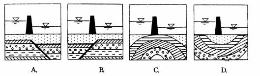 选择坝址是建筑水库的关键之一,下列四种地质构造中最宜建大坝的是