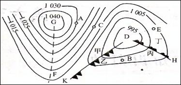 (4)如果冷、暖锋均引起降水,雨区在甲、乙、丙、丁中的哪二个区域 和 。