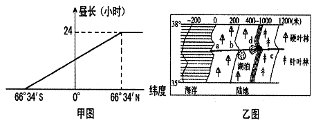 31.图甲表示某日昼长状况,乙图是某地等高线示意图。完成下列要求。(10分)