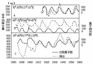 18、读“太阳黑子与年降水量相关性示意图”,回答下列问题。