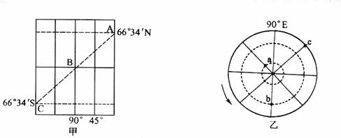 (1)将图甲反映的信息,转绘到乙图中(图中虚线表示回归线、极圈,画出太阳光线、晨昏线,用斜线表示夜半球)(2分)