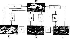 (2)水循环对乙图所示地区直接提供的资源主要有 和 资源。丙图中三角洲形成的主要外力作用是