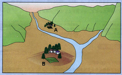 (1)为什么在河流上游,聚落位置选择在地势较低的A地;而在河流中下游,聚落位置