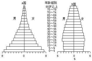 36.根据A、B两国的人口金字塔图,回答下列问题。(6分)
