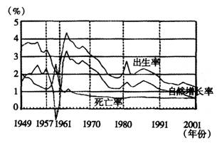 下图为我国1949-2001年的人口发展变化曲线图,图中曲线分别代表出生率、死亡率和自然增长率。读图.回答20-21题。