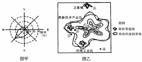 下面图甲是位于平原地区的某城市风向频率图,图乙是该城市地价分布概念图(地价等值线数值a、b、c、d、e依次递减)。读图回答19-20题。