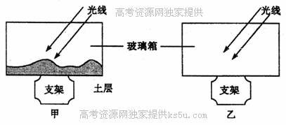 某学校地理兴趣小组做了如下实验,做两个相同规格的玻璃箱(如下目),甲底部放一层土,中午同时把两个玻璃箱放在日光下,十五分钟后,同时测玻璃箱里的气温,结果发现底部放土的比没有放土的足足高了3℃。据此,回答13-14题。