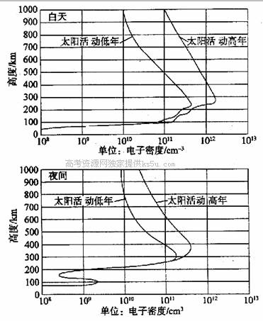16、读下图,有关描述太阳活动与昼夜电离层电子浓度的高度分布的叙述,正确的是( )