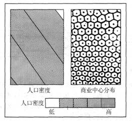 读人口密度和城市内商业中心的服务范围示意图,回答24-25题。
