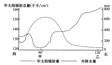 下图是沿“第二亚欧大陆桥”中国段的年降水量和年太阳辐射量分布图,回答33-34题。