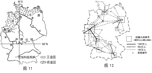 41.德国是欧洲西部面积最大的国家和经济最发达的国家,地势南高北低,地形大致可分为三部分。德国河流众多,其中莱茵河纵贯南北。图11中工业区是世界著名的鲁尔区,这里也是世界著名的城市群。图12是“德国城市间客流量在100万人以上的客流图(1993年)”。读图完成下列问题。(10分)