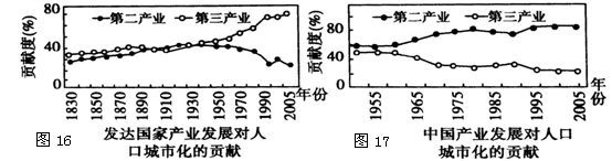 (1)从图16可以获得发达国家第二产业与第三产业发展对人口城市化的贡献随时间变化的哪些地理信息?