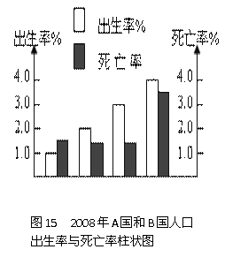 (2)试分别将A、B两国的人口出生率和死亡率转绘到图15中,并将该图中需完善的地方加以完善。(5分)