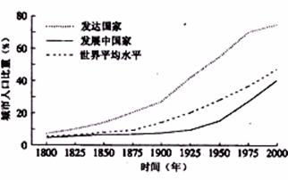 读“1800-2000年世界城市化水平图”,结合所学知识,完成13-14题。