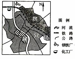 17.若数字①一④表示城市各功能区,则①最有可能是 ( ) A.住宅区 B.商业区 C.绿化带 D.工业区 18.若该城市工业布局合理,则该地主导风向和河流的大致流向是 ( )