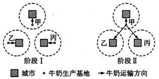 读“甲、乙、丙三个地区牛奶生产和销售模式的变化图” ,回答19-20题。