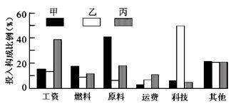 下图中甲、乙、丙反映了三类工厂的投入构成情况,据此回答22-23题。