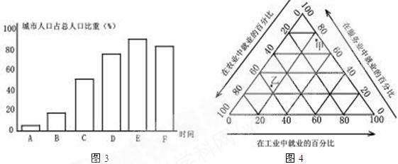 图3为“城市人口占总人口比重变化”图,图4为“劳动力在各行业中的百分比”图,读图回答5-6题。