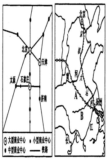 (2)A图的五个商业中心城市中,服务范围最大的是 ,该城市近年来很多居民向郊区和卫星城迁移,这一现象被称为 。(2分)