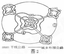 读图2 “华北地区某城市地租等值线分布示意图”(单位:元/平方米),完成7-9题。