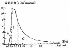 读太阳辐射中各种波长的光所占的比例图,完成5-6题。