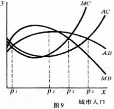 图9是巴顿给出的城市规模的费用/效益曲线图。图中四条曲线的含义分别是,MB:城市每增加一个单位成员对应的城市效益的增加量,MC:城市每增加一个单位成员对应的城市费用增加量,AB:城市中人平均效益,AC:城市人平均生活费用。分析回答21-22题。