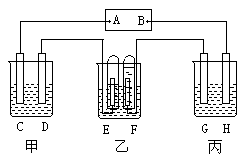 21、(15分)有甲、乙、丙三个串连的电解槽,如下图所示连接。其中电极C、D、E、F都是Pt片,电解G是Fe片,H是Cu片。甲池中电解液为饱和食盐水;乙池中电解液为稀硫酸;丙池中电解液为硫酸铜。当接通电路一段时间后,现象如图所示。