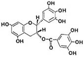 [17].美国每日科学网站4月2日文章报道:美国梅奥诊所的研究人员发现绿茶含有有助于消灭血癌细胞的成分。这项研究利用实验室培养的细胞显示,绿茶中称作“表没食子儿茶素没食子酸酯”(EGCG)的成分通过干扰血癌细胞生存所需的信号传递,能使血癌(白血病)中癌细胞自杀性死亡。另据华夏经纬网2004年2月25日报道,日本科学家发现绿茶中的EGCG能中和脂肪酸合成酵素(Fatty acid synthase简称:FAS),从而能阻止艾滋病毒扩散。已知EGCG的结构式如右图: