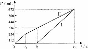 23.(10分)常温下电解200 mL一定浓度的NaCl与CuSO4混合溶液,理论上两极所得气体的体积随时间变化的关系如右图Ⅰ、Ⅱ所示(气体体积已换算成标准状况下的体积),根据图中信息进行下列计算: