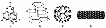 24、(12分)科学家发现C60分子由60个碳原子构成,它的形状像足球(图C),含有C=C键,因此又叫足球烯。1991年科学家又发现一种碳的单质--碳纳米管,是由六边环形的碳原子构成的具有很大表面积管状大分子(图D),图A、图B分别是金刚石和石墨的结构示意图。图中小黑点或小黑圈均代表碳原子。