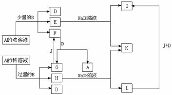24. A-L所代表的各物质是中学化学里常见的物质,已知B、J是单质,A是化合物;E的溶液跟石炭酸溶液混合,溶液呈紫色。