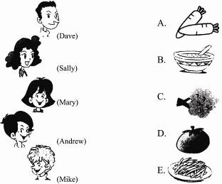 答案:A.Andrew-salad,Dave-ice cream,Sally-carrots,?Mike-oranges,Mary-broccoli