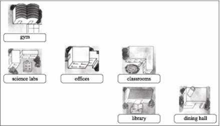 3. The classrooms are_________ the offices. 4. The science labs are _________the gym.