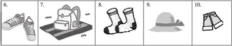 答案:1.pants 2.skirt 3.T-shirt 4.shirt 5.sweater 6.shoes 7.backpack 8.socks 9.hat 10.shorts