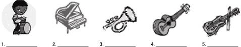 答案:1.drum 2.piano 3.trumpet 4.guitar 5.violin